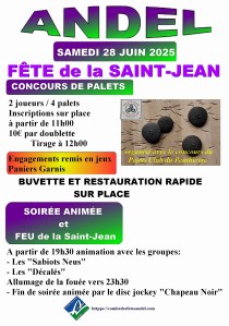 Fête de la Saint-Jean à Andel, concours de palets à 12h00, inscription sur place à partir de 11h00 et soirée animée avec feu de la Saint-Jean vers 23h30, le samedi 28 juin. Buvette et restauration rapide sur place toute la journée.